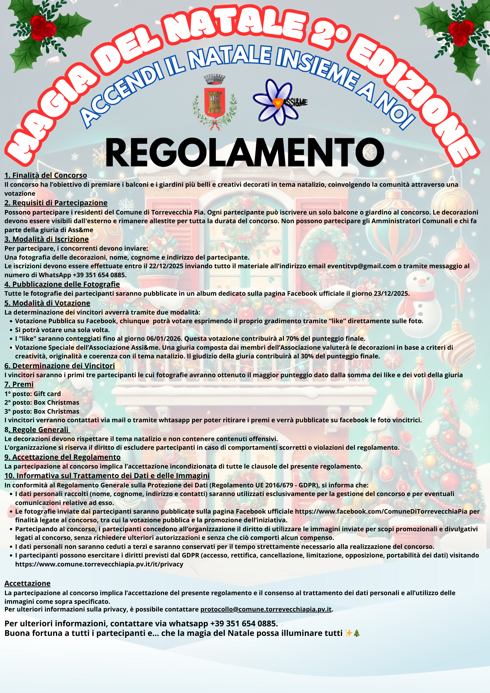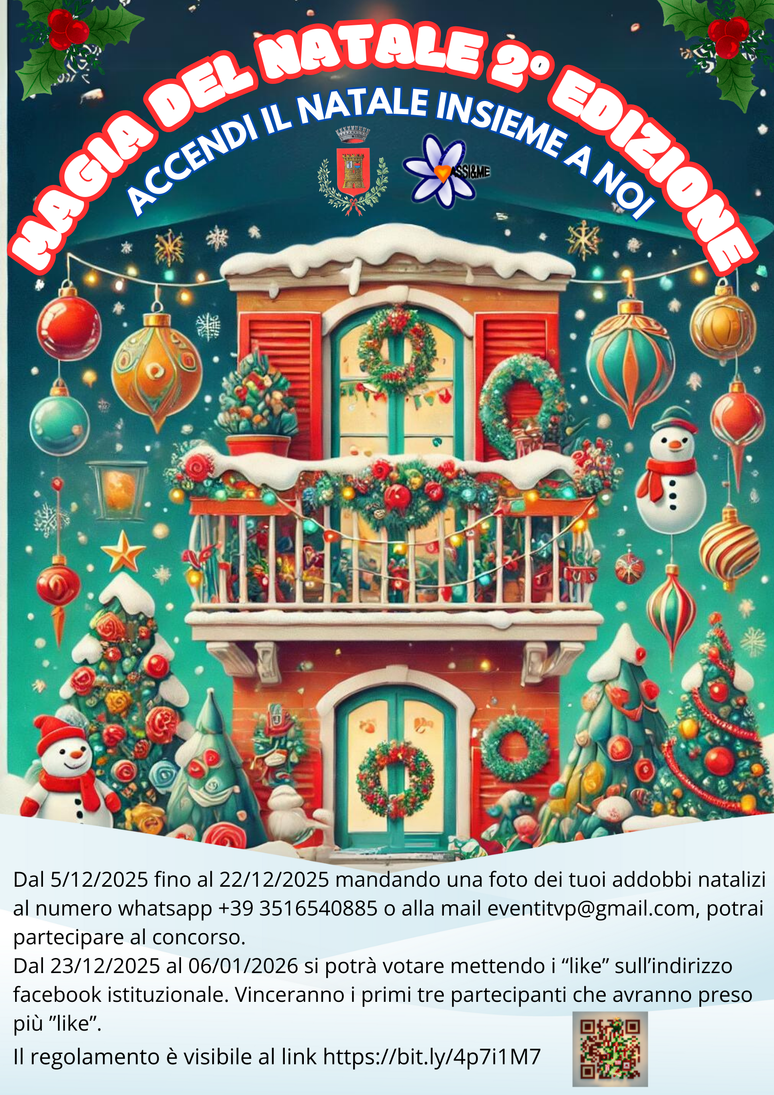 Dal 05/12/2025 fino al 22/12/2025 mandando una foto dei tuoi addobbi natalizi al numero whatsapp 3516540885 o alla mail eventi tvp@gmail.com, potrai partecipare al concorso. Visionare il regolamento allegato.